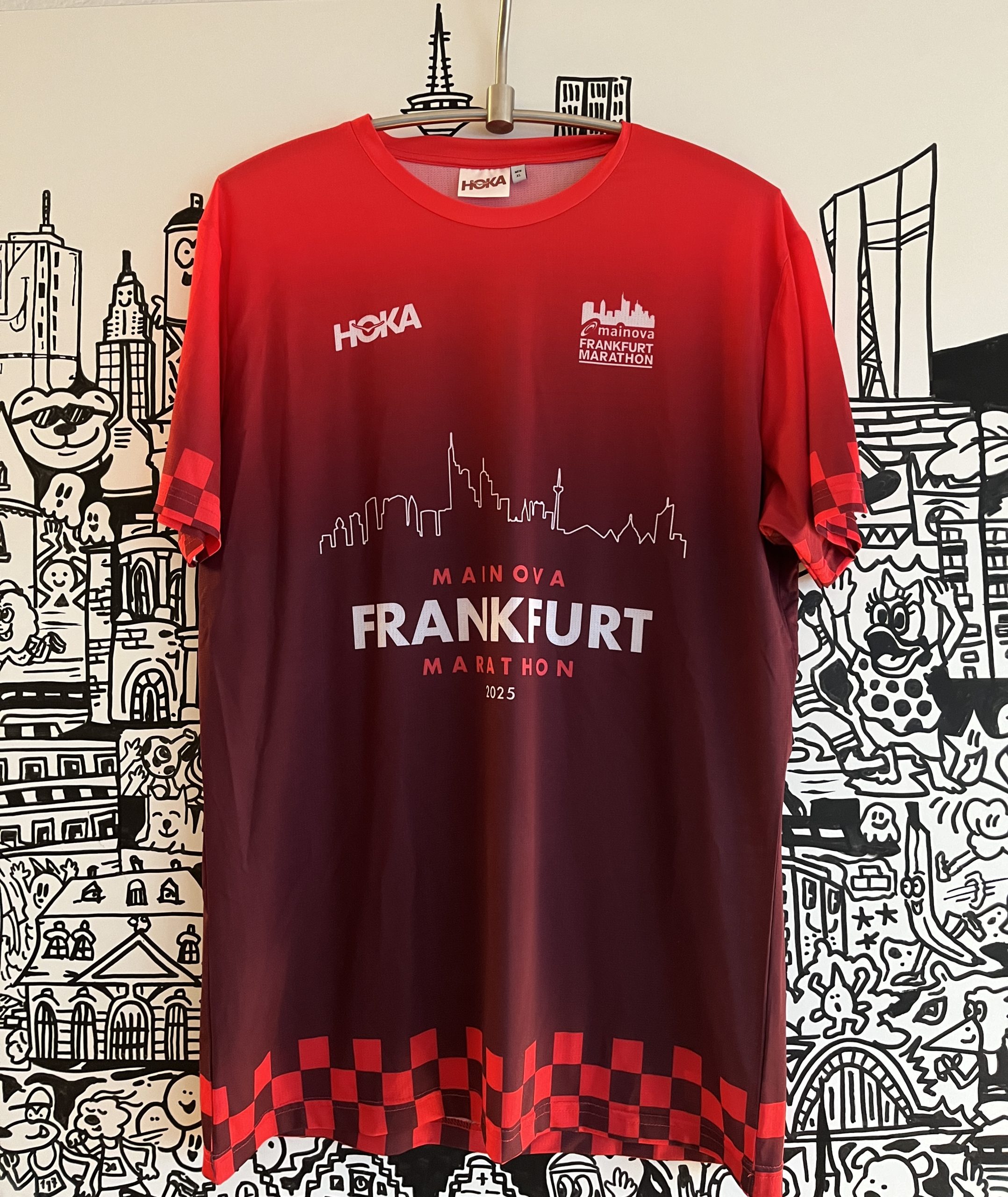 - Print: Skyline x 42.195| HOKA (Brust) | Mainova Frankfurt Marathon-Logo (Brust) | Jubiläumslogo (unterer Saum) | Fly Human Fly (Ärmel)